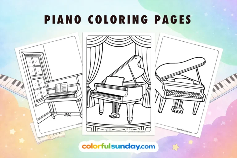Here you’ll find 37 piano coloring pages ready to download and print. They can be as simple or as fancy as you want them to be. Some show a big grand piano with its lid open, while others focus on just the keys or the pedals.