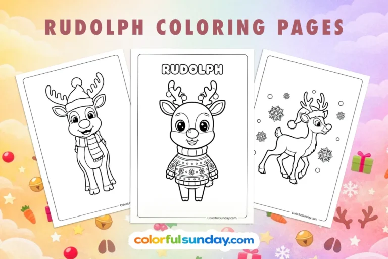 You can print our free printable Rudolph coloring pages at home and start filling in minutes. Use crayons for soft, cozy shades, or grab colored pencils and markers if you want brighter details on the harness, bells, and snowy backgrounds. We like adding a warm golden yellow around Rudolph’s nose, so it looks like it really glows in the dark winter sky.
